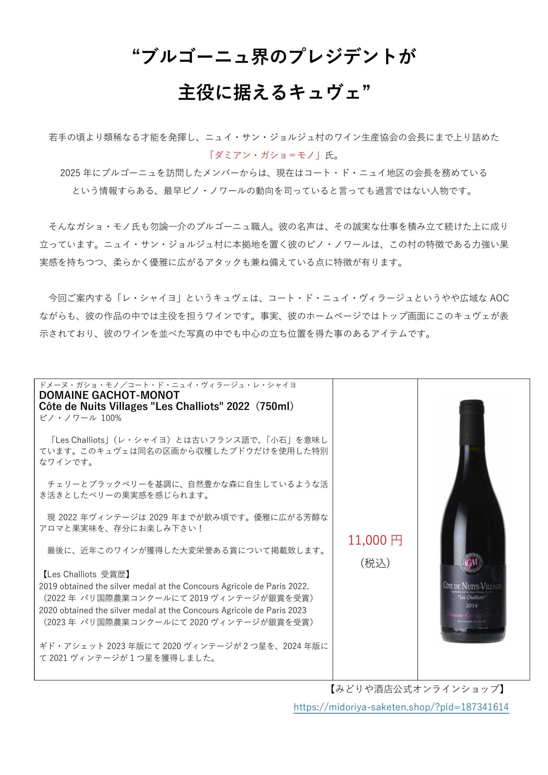 ブルゴーニュ:ガショ・モノ氏の傑作が入荷しました。 詳しくはこちら